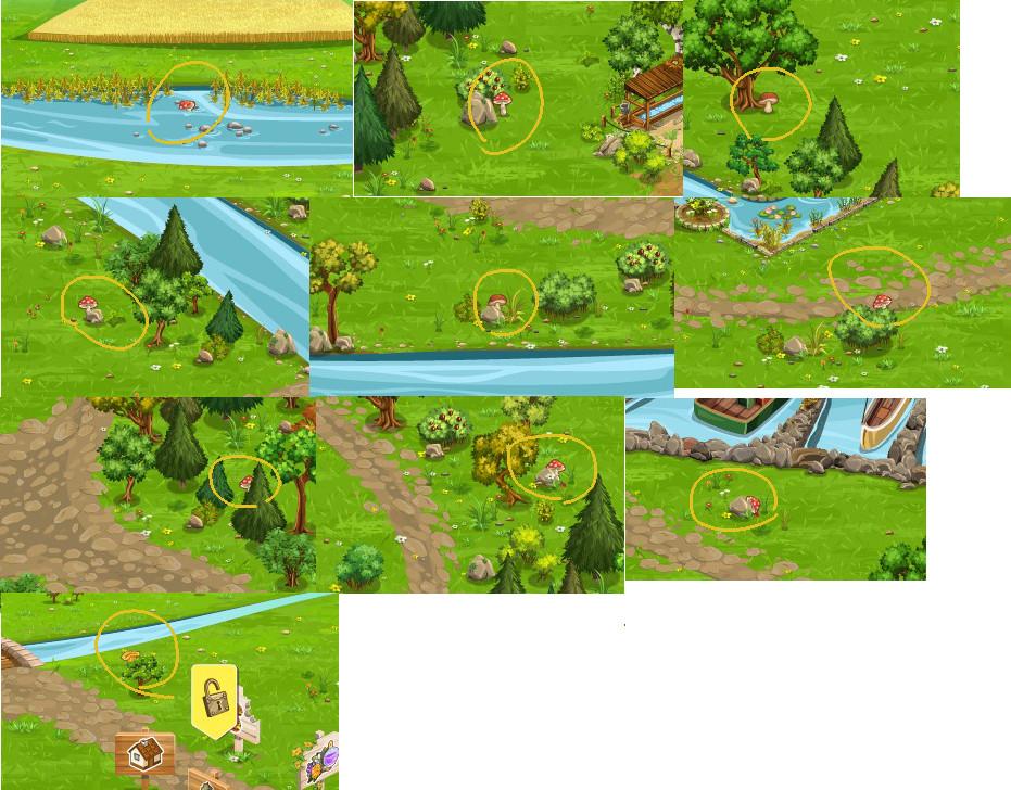 un champignon, bien en évidence mais tout petit malgré loupe et qui m'a donné du fil à retordre : sur le petit banc à côté du panneau d'affichage des scores dans le ranch