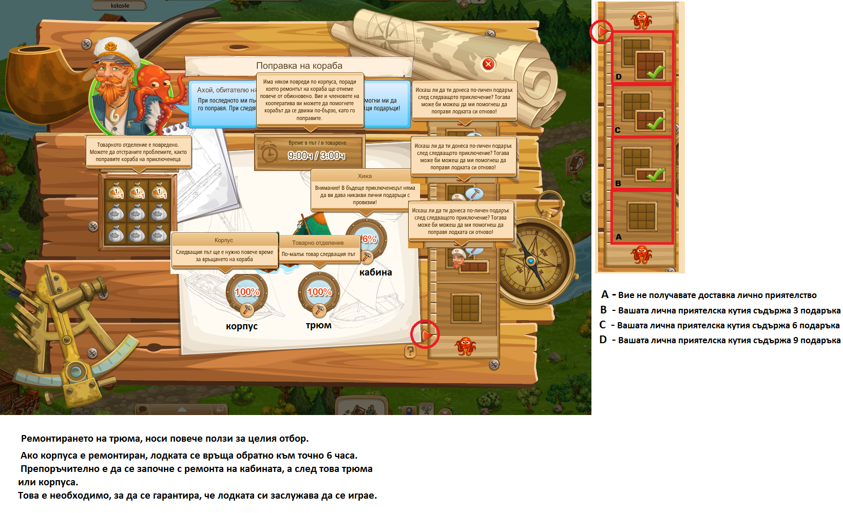 Ъпгрейдването на лодката ще води до по-добри награди. Ремонтът на лодката ще води до повече награди.