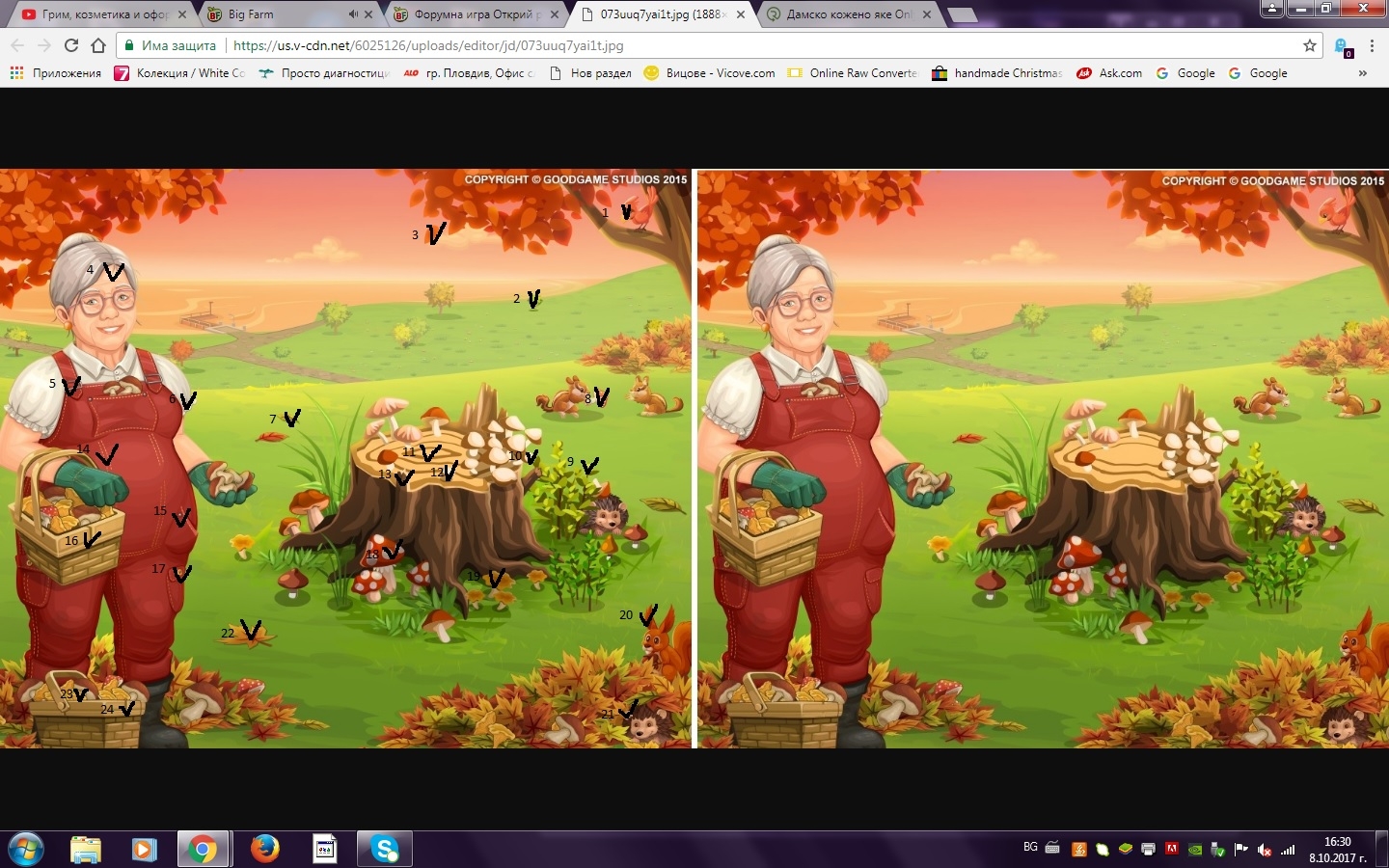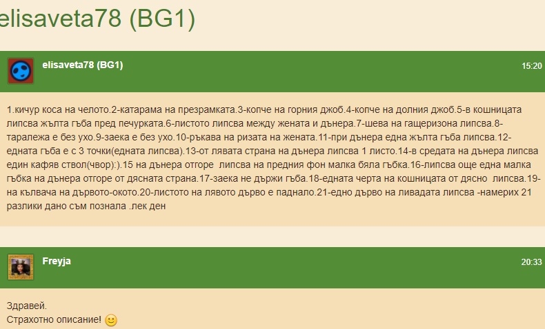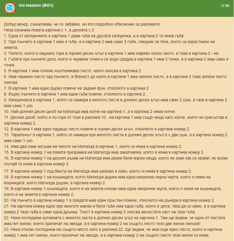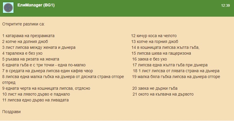 А на мен, на лично съобщение, ще изпращате снимка с отбелязаните разлики или ще ми описвате къде и какво сте открили. Моля, изпращайте ми само по едно съобщение само тогава, когато сте сигурни, че сте открили максималния брой.