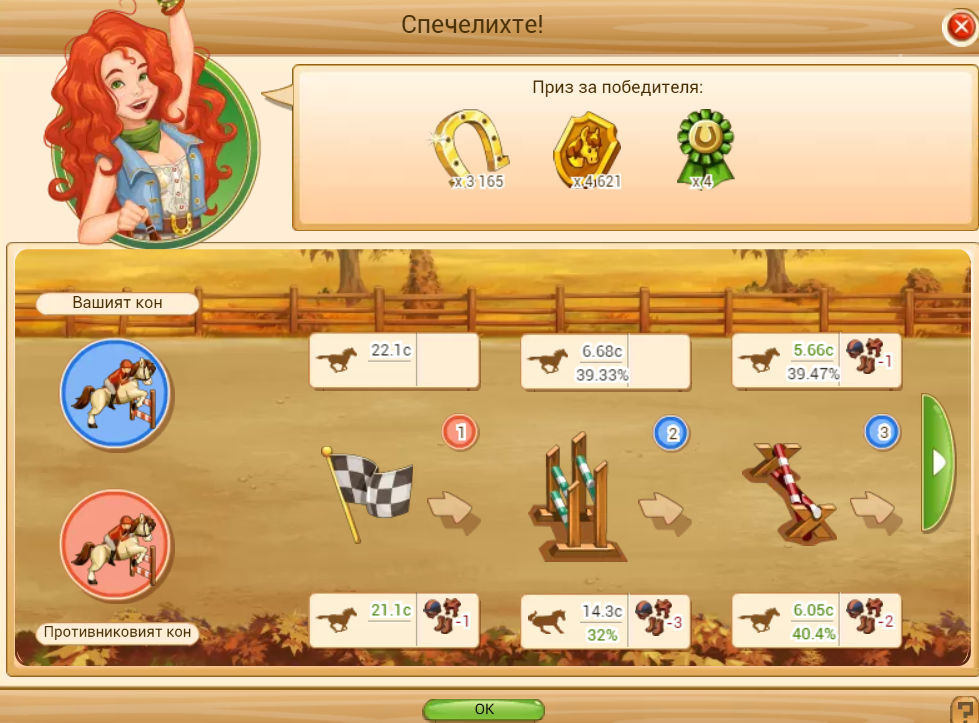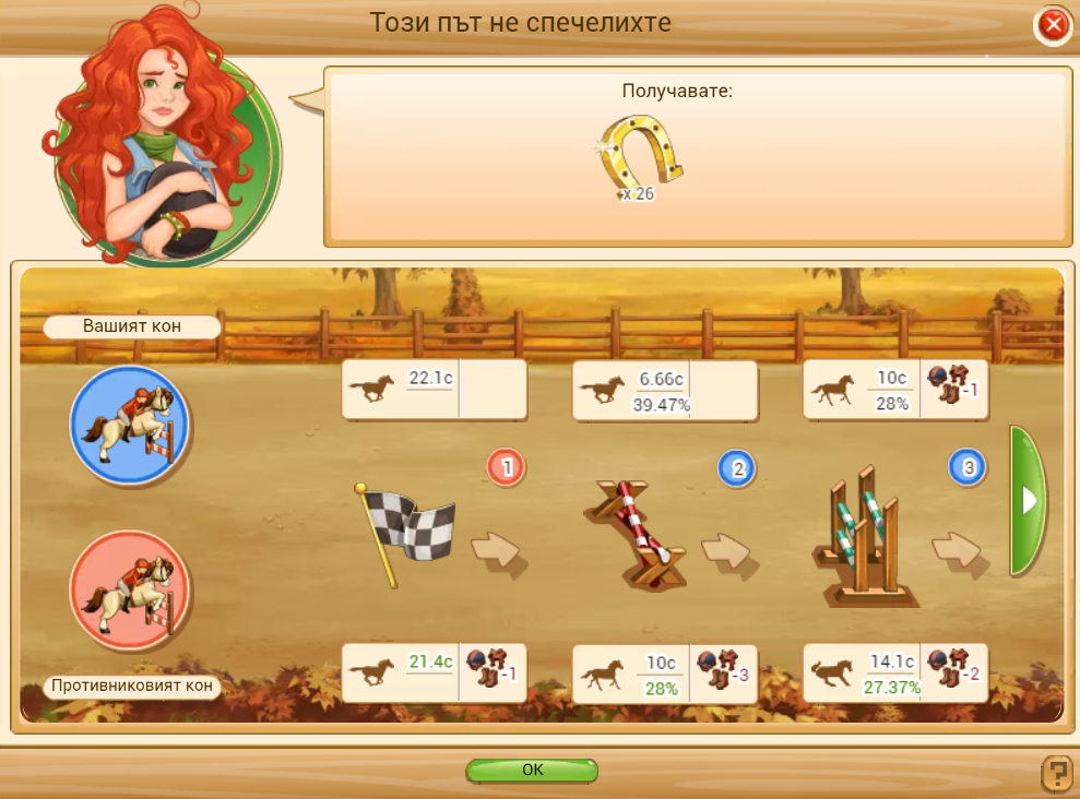 Не знам какво намалява и увеличава шанса за победа при състезаване с един кон, не ме и интересува толкова, не разсъждавам по този въпрос, защото смятам, че не е необходимо. Конят ми е на 201 во ниво и се занимавам от самото начало откакто са пуснали да се правят коне и ми е много чудно когато падна от едно агне на 130 то ниво, което се е пръкнало от месец, а моя кон е 7 и повече годишен.