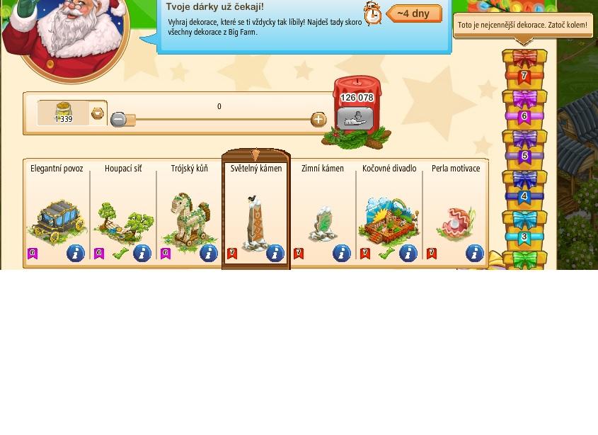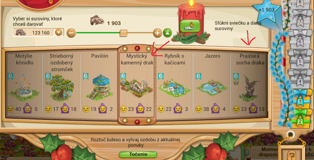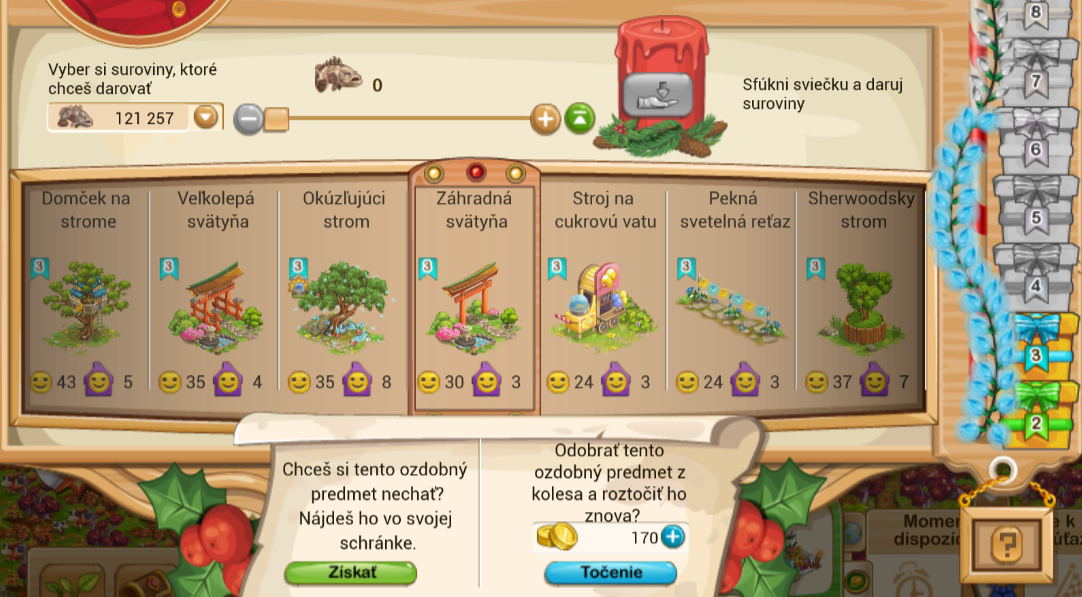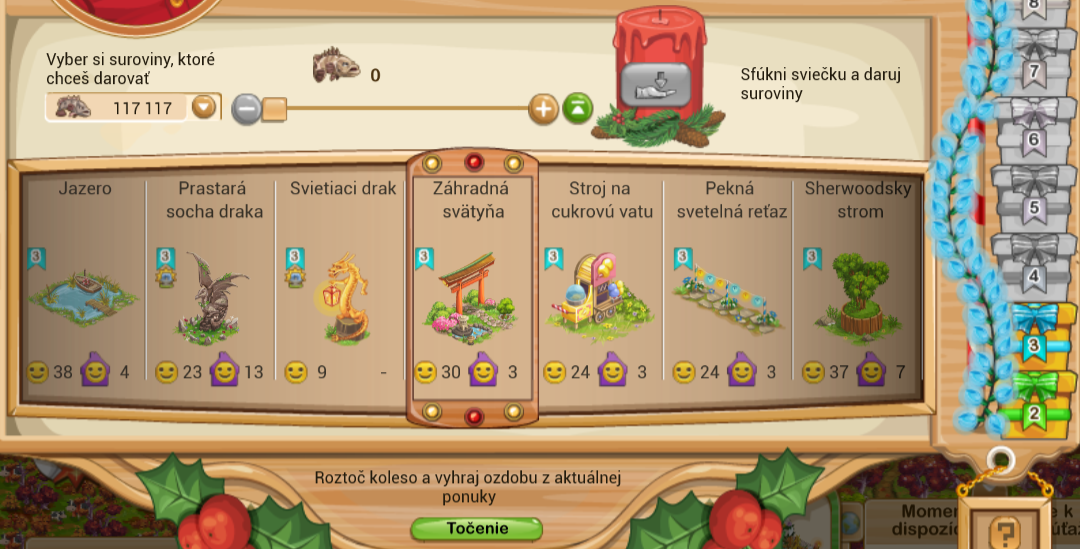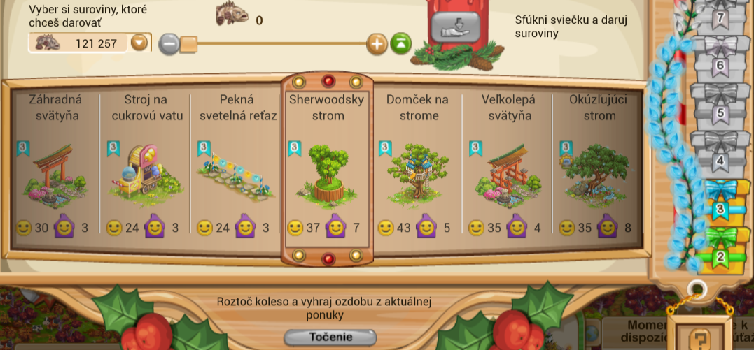No, tak som pridala veci na dosiahnutie tejto úrovne, sfúkla sviečku a dala točiť. Lenže potom ako sa spustilo točenie, žiadané ozdoby zmizli z tejto ponuky. A ako sa koleso pretáčalo, tak ich tam ani vidno nebolo.