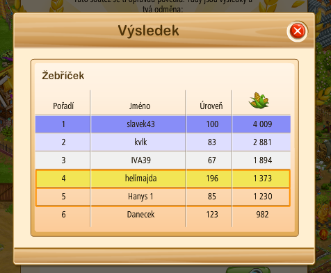 Moc nechápu, proč tu někteří řeší úroveň soutěžících, podle úrovně se fakt nepozná, co se dá očekávat od soupeřů. Např. pole jde na 6. úroveň vylepšit v 53. lvl, tozn., ze v 53 lvl si může pole vytunit i architektem na úroveň 8. Naproti tomu hráč ve 100. lvl může být zaměřen na sady a pole může mít jen na 5. úrovni. K tomu navíc počet polí. A v neposlední řadě i knihovna. K tomu všemu ještě special semena a superhumus nebo prvotřídní humus. Navíc zrovna hráč na vysokém lvl může mít zasazeno něco zcela jiného a nebude mít šanci dohnat někoho na o dost nižším lvl, kterému tahle soutěž bude hrát do karet, neb na ní bude připraven. Takže jak z tohoto, co není vidět, chce někdo odvodit férovost přiřazení soutěžících do soutěže jen na základě levelu?