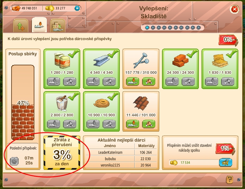 Zdravím, ve vesnici u skladiště nám svítí "ztráta z přerušení 3% za den" (viz obrázek) a to i přesto, že dodáváme pravidelně několikrát denně. Ještě včera svítilo 2%. Pokud si ale správně pamatuju požadované množství hřebíků a šindelů. je stále stejné bez ohledu na zobrazovaná procenta. Nenašel jsem, že by se to tu někde řešilo.