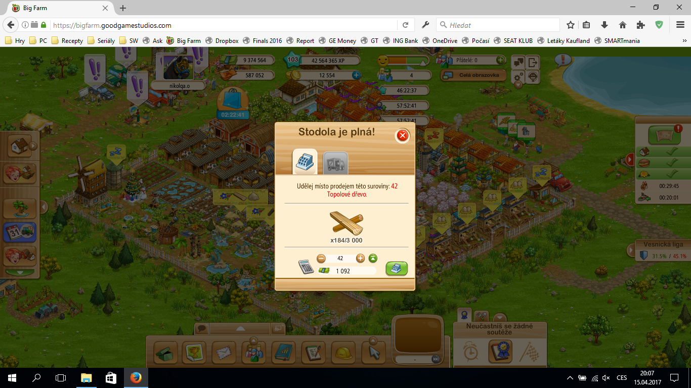 Zdravím. pěstoval jsem smrkové dřevo podél polí s kukuřicí... když to chci sklidit píše že stodola je plná... na tlačítko prodat nereaguje a žádné dřevo nikde nemám jediné co mám jsou zaseklé 4 pole s tisícovkou kuku a ještě mám po akci těžce pracujících