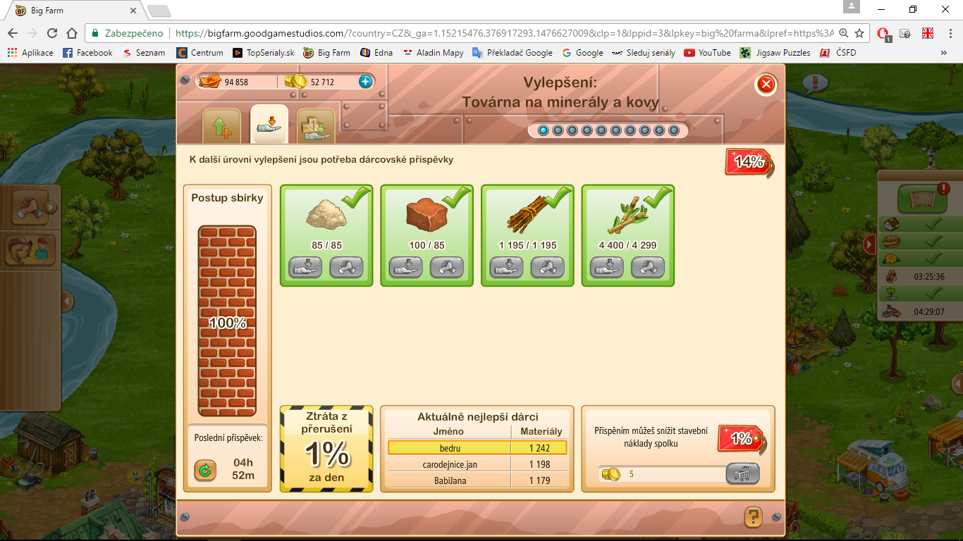ahoj,mame darované všechny suroviny a přesto to nejde ve spolkové vesnici zvyšit.to samé jako má bedru.dik za odpoved