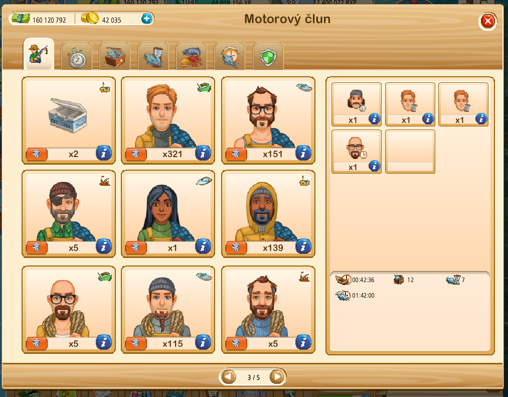 Ahoj, mám motorové čluny na urovni 2. kapacita lodi je 10 ryb. lode mi vzdy vylovi jen 2 - 3 ryby. Zkoušela jsem různé kombinace příslušenství ale nic se nezměnilo. Co s tím? Může mi dát někdo radu? Dík