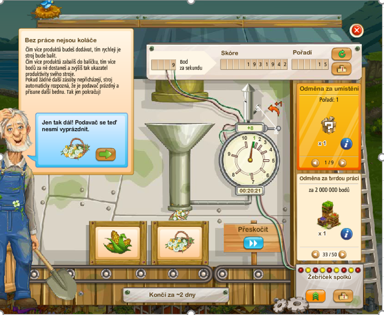 Když se přisunula bedna s jablky, bohužel nevím kolikátá to byla, ale bylo to při snažení o 10. odměnu, stroj se zasekl, na obrazovce zůstala ta bedna s jablky a ostatní zmizely. Desátou odměnu už jsem nezískal. Když sklízím jablka, tak obrazovka probleskuje jako bych plnil podavač, ale budík se neobjeví nic se nepřičítá. Stroj stojí a neukazuje ani žádný čas. Jen žebříček zřejmě funguje, protože vidím, jak se stále propadám.Lépe to vysvětlit nedovedu. S počítačem nejsem moc kamarád, takže screen doložit neumím :-) Omlouvám se :-)