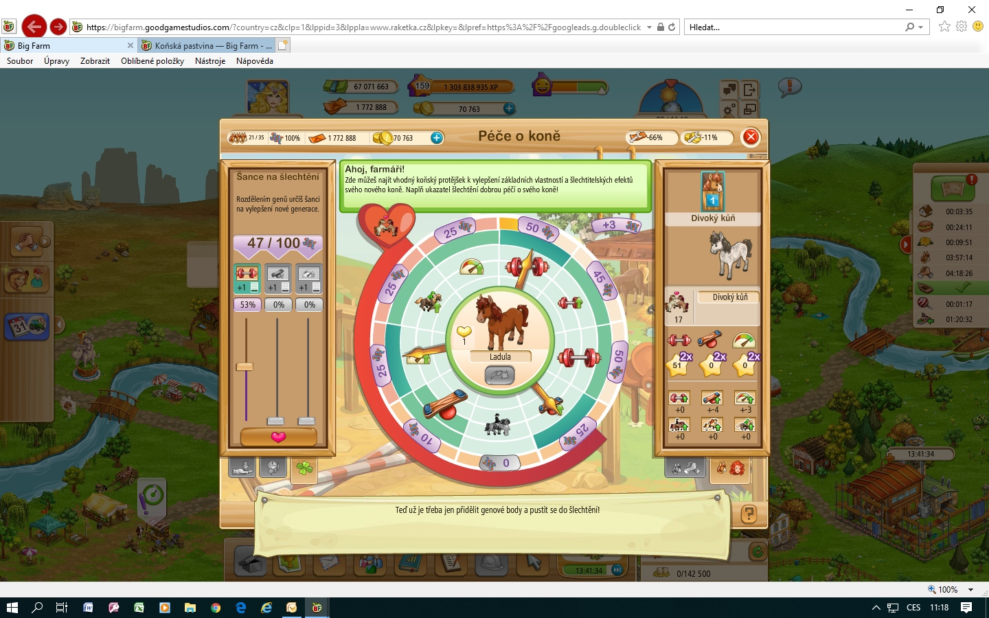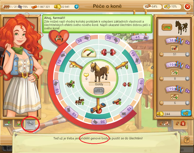 Potřebovala bych poradit. Mám koně na koňské pastvině. Už jsme splnili srdíčka, máme šlechtit. Vybrala jsem si a zaplatila divokého koníka. Mám rozdělit geny, ale jde mi pouze první šoupátko, další dvě jsou zablokovaná, nesvítí. Ale stále mi to hlásí, že nemám rozdělené geny, což ale nejde. Nemohu ani šlechtit, ani začít znovu koníka vylepšovat. Ba ani dostat zpátky do stáje. Prosím o radu.