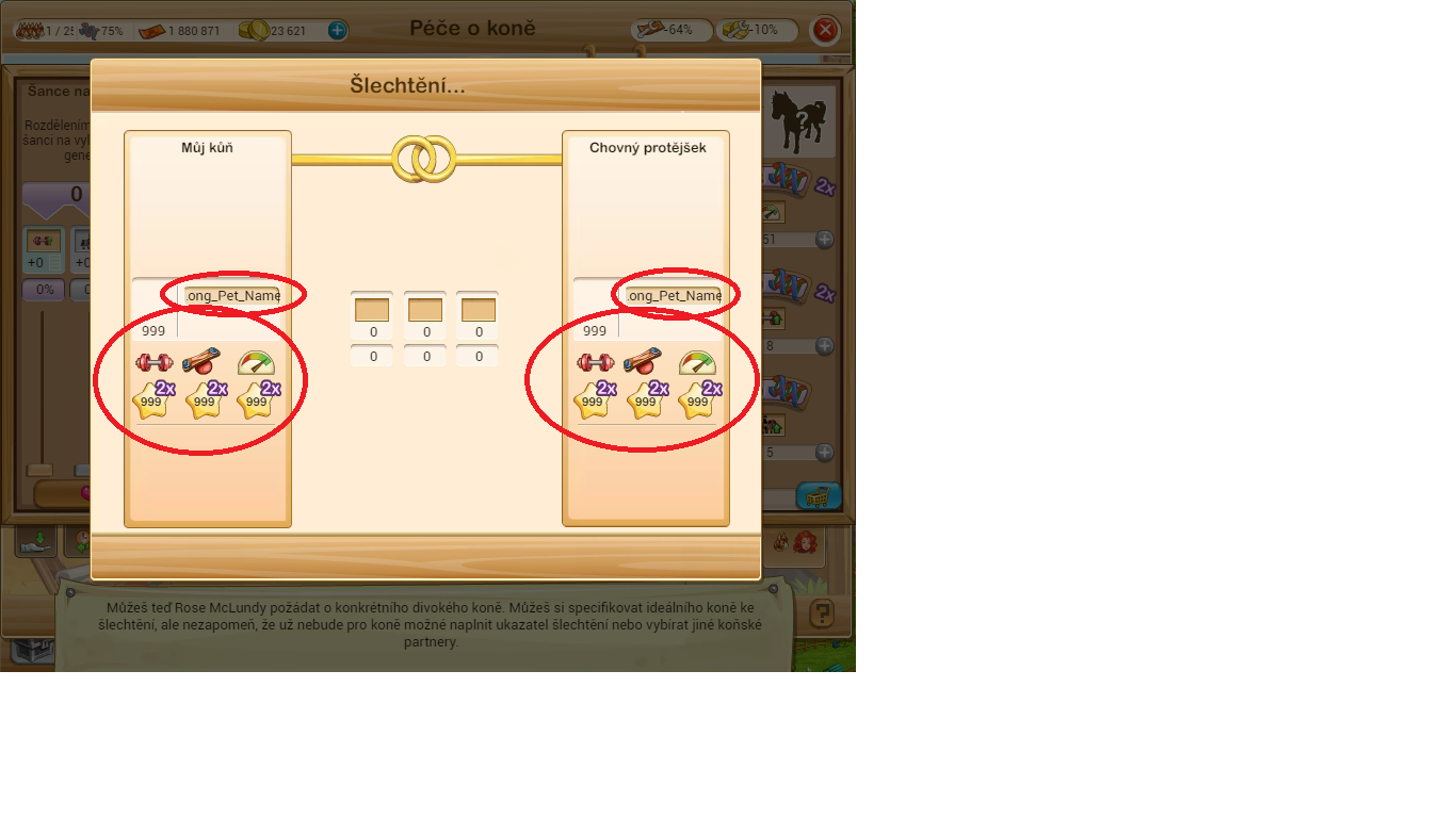 Tři vlastnosti/efekty divokého koně vidíš před jeho koupí. Pokud ti dané hodnoty nevyhovují, zelenou šipkou nahoře můžeš kolo se šipkami, které ti vybírá 3 vlastnosti/efekty posunout za zlaté: