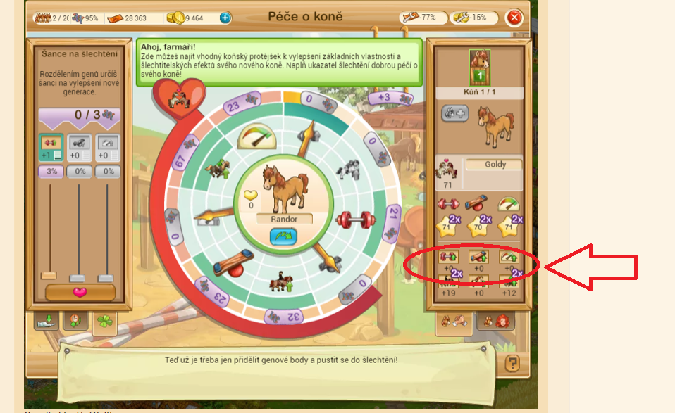 U předchozí bylo možno 1 křížení, tady zvládneme 2. Od chovné hodnoty koupeného koně se tedy posouváme až o +45. Přibližujeme se tak chovné hodnotě 100 a dál můžeme pastvinou na základních vlastnostech navýšit až k 120 (140).