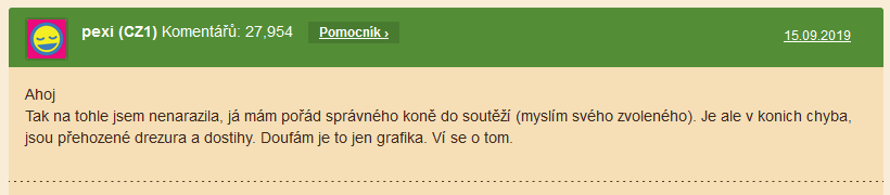 Jsem vedoucí týmu CzechFarmTeam a stále žádám o opravu na koňské farmě. Jedná se o nefunkční nástěnku a nefunkční turnajový přepravnník u mých tří hráčů. Je mi velice trapné, zde stále donekonečna rozepisovat ale aby za měsíc se neopravilo vůbec nic, tak to je síla. Věřím, že se na problém podíváte, a dáte konečně věc dohtomady. Děkuji za konečné vyřízení a jsem s pozdravem BeruskaVerka