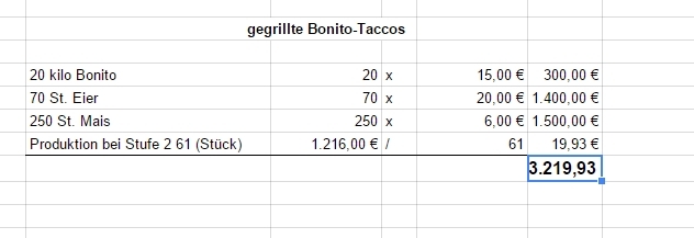 Macht also ein Gewinn von 5405,00 € für 61 Bonito-Tacos ( ~ 88,61 € pro Taco )