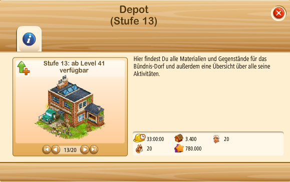 wir konnten das Level 12 Depot ganz normal ausbauen auf 13: