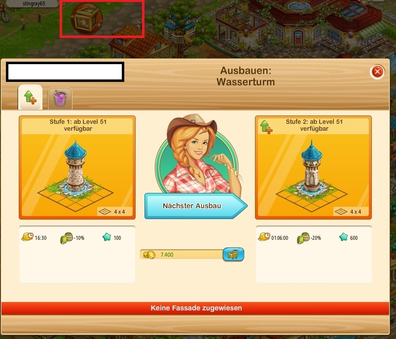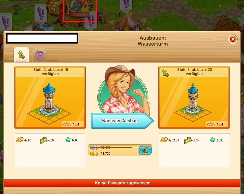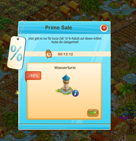 Ich hatte bisher auf der Blumenfarm noch keinen Wasserturm und habe ihn gerade gebaut. Kaum war die Stufe 1 abgeschlossen, ploppte ein nettes Angebot auf: -10% Preisnachlass auf einen Wasserturm. Äh, ja, toll. Aber wieso jetzt, wenn schon auf allen Farmen ein Wasserturm steht? Dann hab ich noch schnell die Stufe 2 gestartet, bevor die Angebotszeit ablief, in der Hoffnung, der Preisnachlass würde hier auch gelten. Aber mitnichten, es wurde der volle Goldpreis abgezogen.