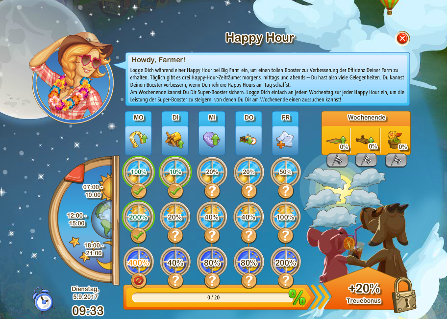 Ich habe es denn nun eben ausprobiert und bin extra auf der Farm geblieben und siehe da, dann wurde der Bonus angezeigt, somit komme ich zu dem Schluss, dass irgend wo ein Haken in der Happy Hour sein muss, dass einige Spieler Probleme haben.