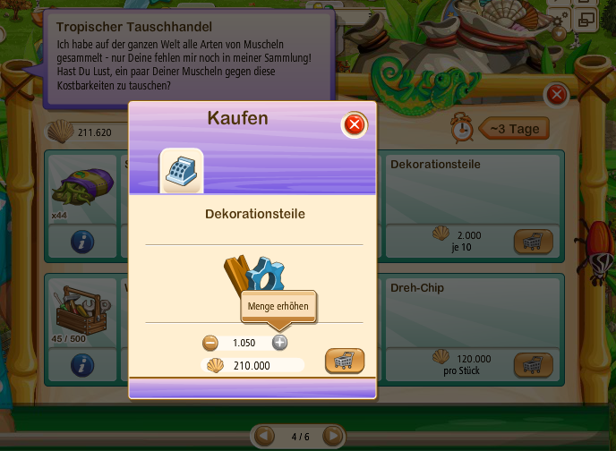 Da man die Menge der zu kaufenden Waren beim Eventhändler nur durch klicken auf das Plus erhöhen kann, muss man manchmal ganz schön oft klicken (im Bild: 104 Klicks für eine Menge von 1.050), um zu seiner gewollten Menge zu kommen. Ich wünsche mir die Möglichkeit, die gewünschte Zahl einfach per Tastatur eingeben zu können, wie es ja im Inventar zB auch funktioniert.