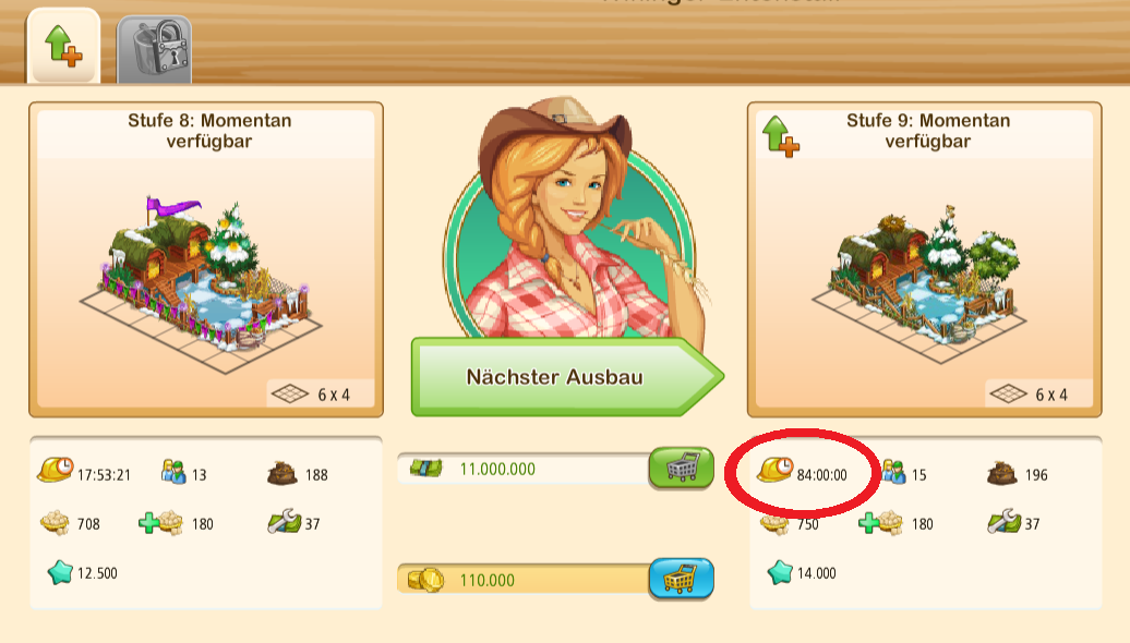 Beim Ausbau des Entenstalls auf Stufe 9 werden bei mir 120 Stunden angezeigt. Hier müsste dringend nachgebessert werden. Der Ausbau von Stufe 7 auf Stufe 8 beträgt nur 25 Stunden. Alle anderen Ställe haben bei der höchsten Ausbaustufe nur Bauzeiten von ungefähr 24 Stunden. Insofern würde ich mir wünschen, wenn die Ausbauzeit der Entenställe massiv gekürzt werden.