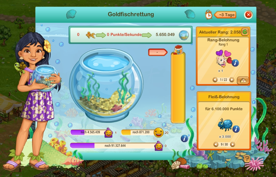Beim aktuellen Goldfischevent hatte ich Goldfische im Glas und ca. 5,6 Mio Rettungspunkte erspielt.