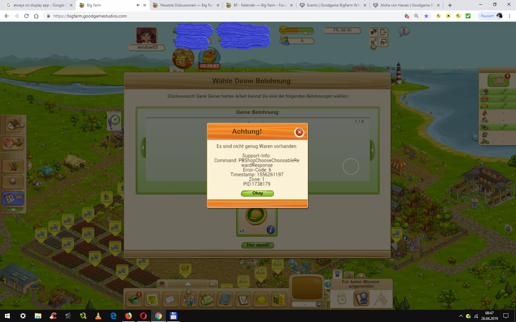 Ich kann zwar anklicken, dass ich die Münzen haben möchte, aber nach mehrmaligem bestätigen geht das Popup nicht weg, sondern es kommt diese Fehlermeldung. Damit man weiter spielen kann, muss man die Seite neu laden.