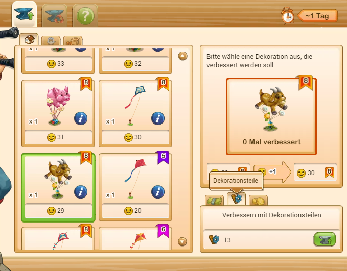 der erste Schritt ist der preiswerteste, er kostet 13 Teilchen und die Ziege wäre auf 30 Zufriedenheit