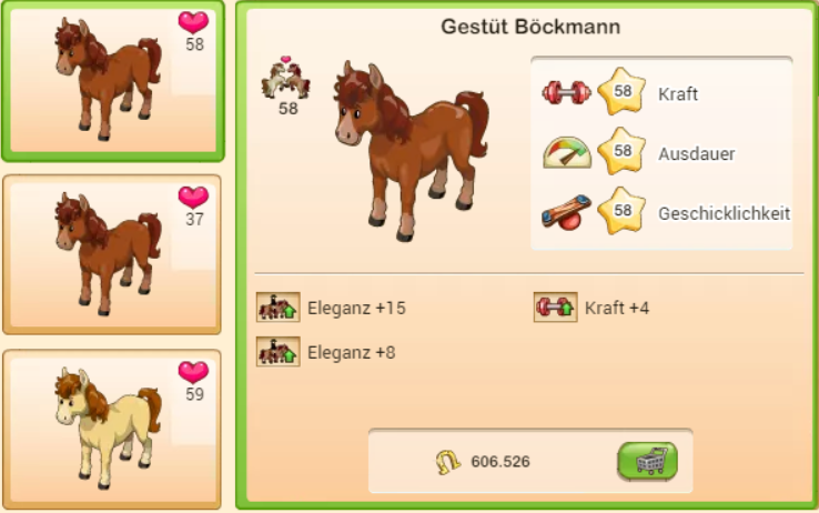 Ich habe meistens sehr viel höhere Pferde im Angebot (auch mit Zuchtqualitätsstufen), kosten aber natürlich auch viel mehr goldene Hufeisen.