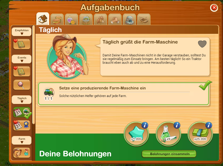 und man müsste ja 2x die Aufgaben mit Herzchen morgens markieren, es passen ja keine 3 in die Leiste... das vergesse ich meist, wie die Aufgabe der Pferdefarm.. wären sie aber erfüllt, ohne dass man das Herz gesetzt hätte und das Buch wäre dann mit grünem Button, würde man es zumindest merken..