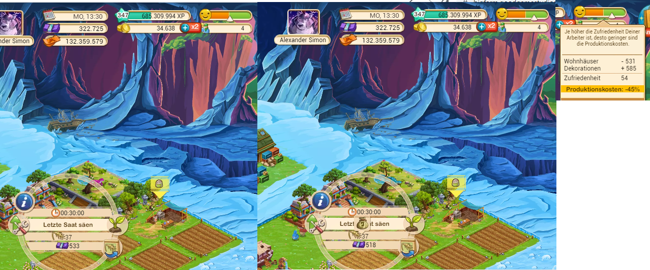 Wenn wir aber den Eingangspost anschauen, dann haben wir 533 bei 0% Zufriedenheitsbonus und 518 bei 45% Zufriedenheitsbonus, d.h.:
