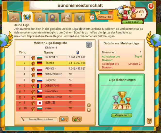 Bulgarische Topbündnisse mit 4 Personen oder so schießen ja gerade aus dem Himmel. Und wenn sie sich in dem Tempo weiter vermehren wie zurzeit, ist es nur eine Frage der Zeit, wann die Top 5 der Meisterliga ausschließlich aus Bulgaren besteht. Dann würden so in ca. 3-6 Wochen keine anderen Länder mehr in der Top 5 sein. Und wenn GGS da nicht langsam etwas dran ändern wird, wird genau das eintreten.