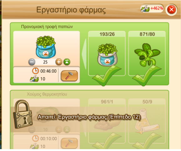 Μόλις το αναβαθμίσεις στο επίπεδο 12 τότε θα έχεις και τα χούμο θερμοκηπίου διαθέσιμα για παραγωγή