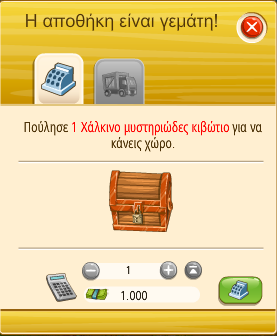 το εργαστηριο φαρμας στο επιπ 10 παραγει χαλκινα μπαουλα, σημερα λοιπον το πρωι βαλαμε τα αναλογα δωλοματα και το απογευμα που πηγαμε να παρουμε το μπαουλο βγαζει μια καρτα κιτρηνη και λεει οτι η αποθηκη ειναι γεματη και θα πρεπει να πουλησω 1 μπαουλο! ειναι το πρωτο χαλκινο μπαουλο που ξεκηνησαμε να φτιαξουμε! δεν δουλευει στην αναβαθμηση λεβελ 10? τι αλαξαμε φαρμες τι ξανασυνδεθηκαμε 10 φορες τα ιδια λεει!! και μας εχει μπλοκαρει και το κτιριο και δεν μπορουμε να παραξουμε τιποτα!!! καμια προταση???