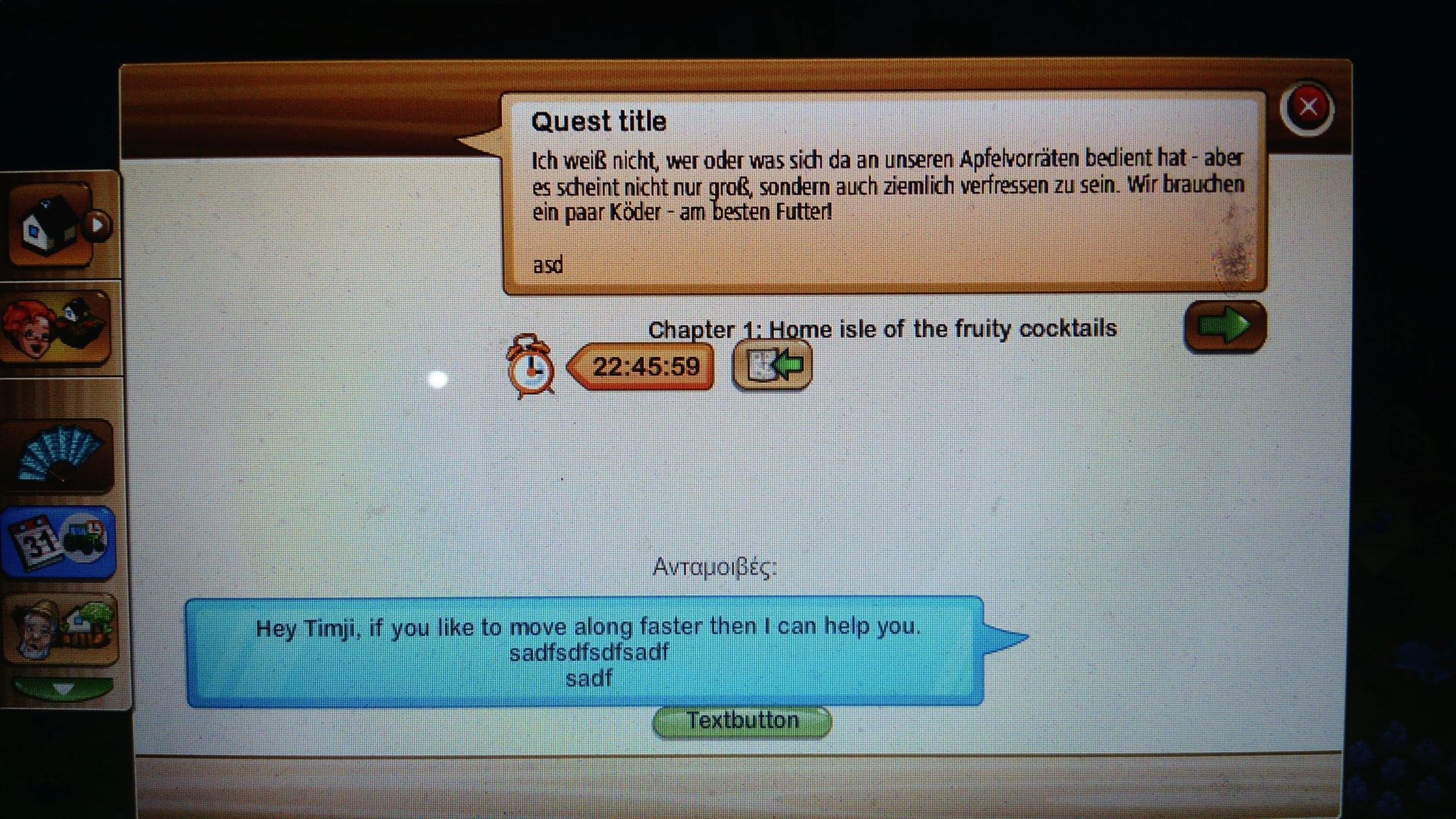 Καλησπερα. Βλεπω οτι τελικα δεν ειμαι ο μοναδικος που εχω προβλημα με την Μυστηριωδη Ασια .. Πλεον μου τα βγαζει στα Γερμανικα , δεν μου ανοιγει το παραθυρο με αυτα που ζηταει ( ειμαι εκει που ζηταει αυγα, λαχανα και ρυζι ) .. Τι κανουμε τωρα ? Το συνεχιζω ή το παραταω ? Και φυσικα, οταν παω να ανοιξω καποιο απο τα παραθυρα των event ( Παγκοσμιο , Αγ.Πατρικιος , χρυσοψαρα ) μετα σκοτεινιαζει η οθονη και θελει ρισταρτ για να στρωσει .. Αυτα .