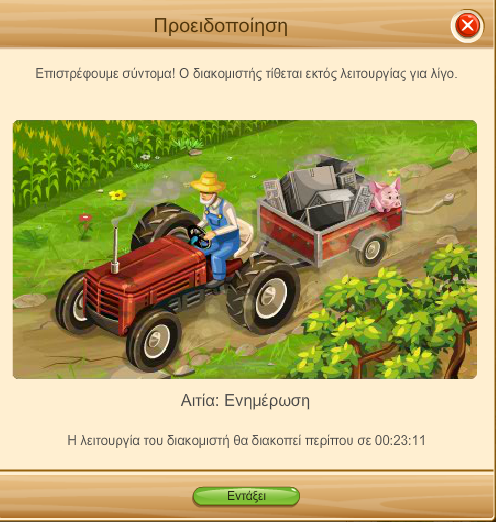 σπόροι σαςΌπως καταλαβαίνετε κατά την διάρκεια του hotfix οι servers του παιχνιδιού θα παραμείνουν κλειστοί, και δεν θα μπορείτε να συνδεθείτε στο παιχνίδι , θα προσπαθήσουμε αυτό να είναι όσο πιο σύντομο και αποτελεσματικό γίνεται.