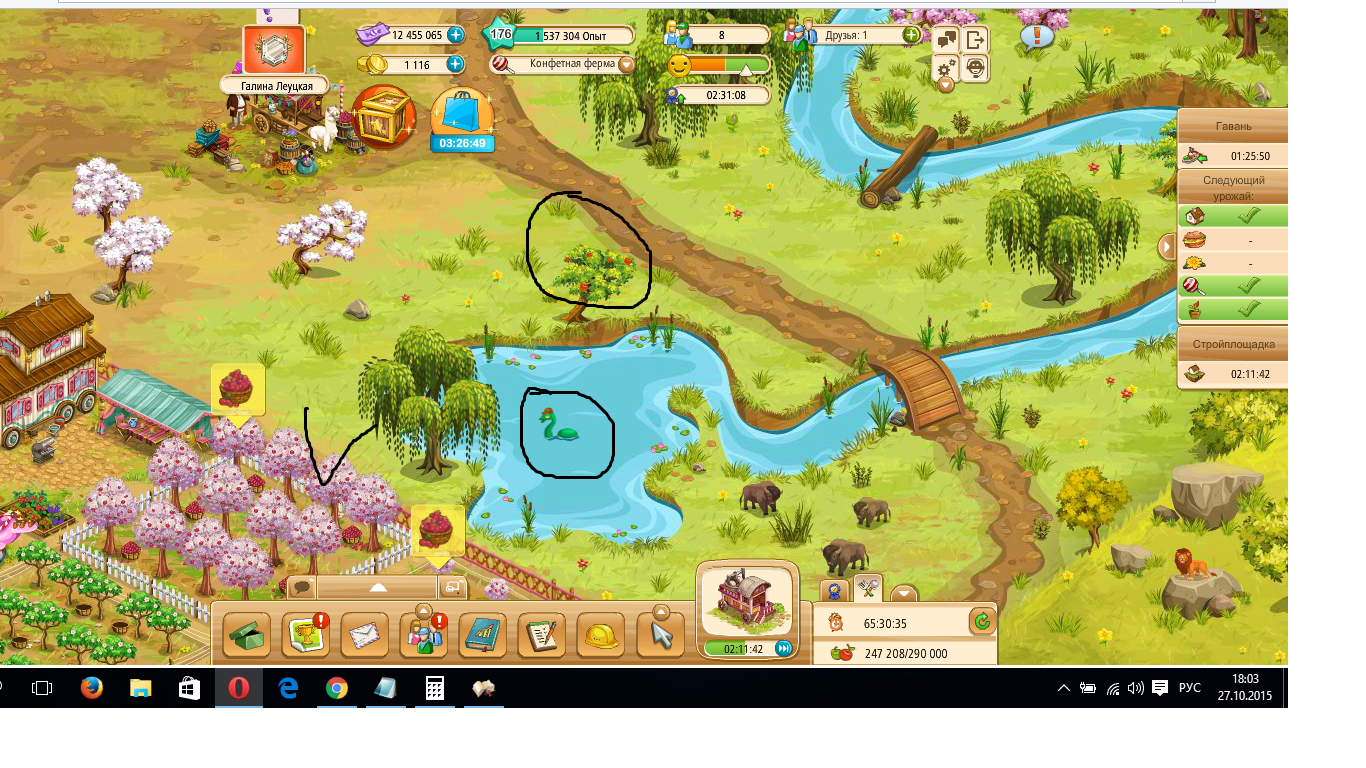 На конфетной фабрике есть дракончик в пруду.Иногда на дереве около пруда появляются яблоки.