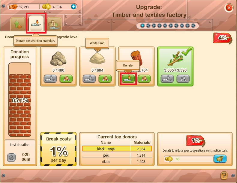 10.) И , наконец , если все требуемые материалы пожертвованы, вы можете модернизировать завод. Обновление даст вам КООП XP и вы можете перейти к следующему уровню деревни.