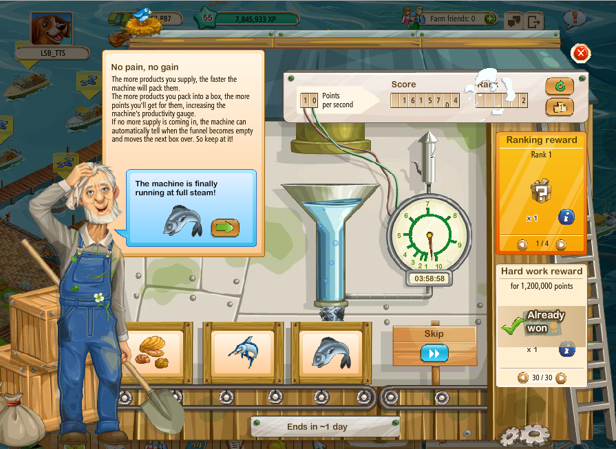 During the most recent HWE (new Fishing variant - FHW), I, for the first time ever, raised my packer to the 10 points per second level. I had done some careful calculations to plan for reaching the final prize (1.2 mil points). It would be reachable. I was running at 9 pts/sec with more than enough run time on the clock to exceed the end of the event. I calculated though, that I needed to make it to 10 pts/sec for the last five and half hours. The boat with the harvest that would cross me to 10 pts/sec was returning to dock at 5hrs45mins before the end of the event. Feeling pretty good at this point.