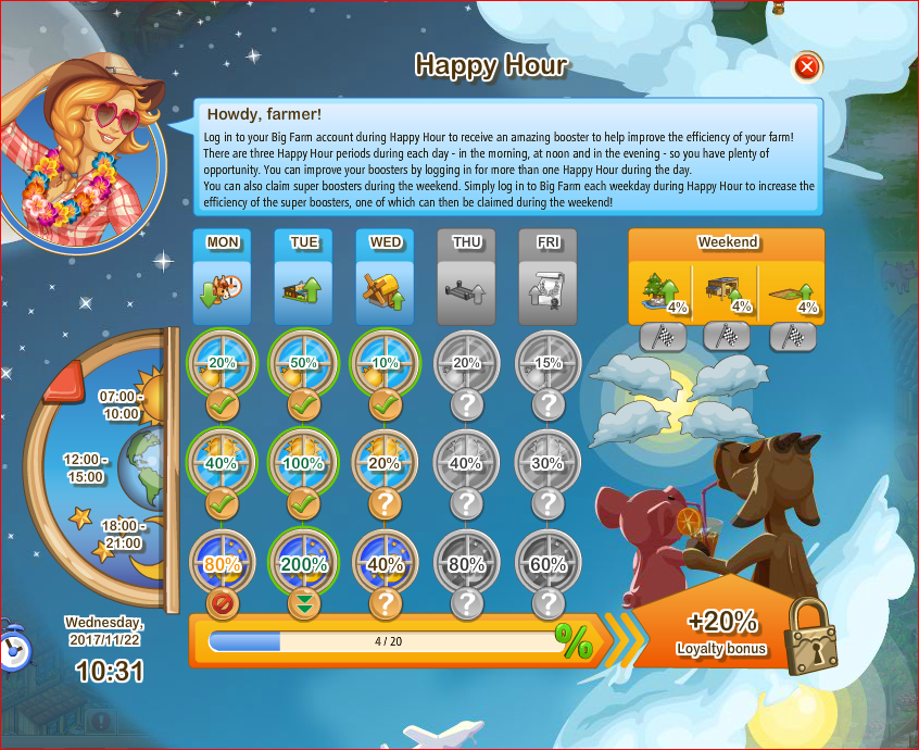 if anything happy hour is frustrating and unachievable how can any one sign in 3x a day if they have IE job a family a life only someone who has nothing else to do in there day ca sign in 3x a day to get the weekend booster points it should be more achievable for players to get a weekend booster ...