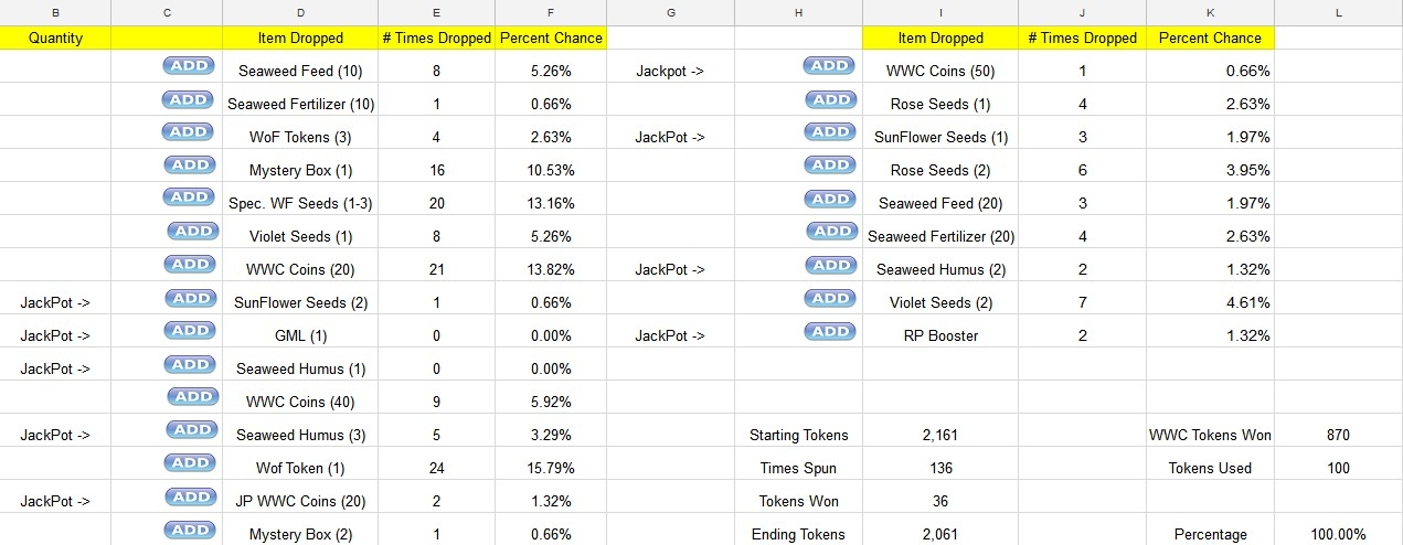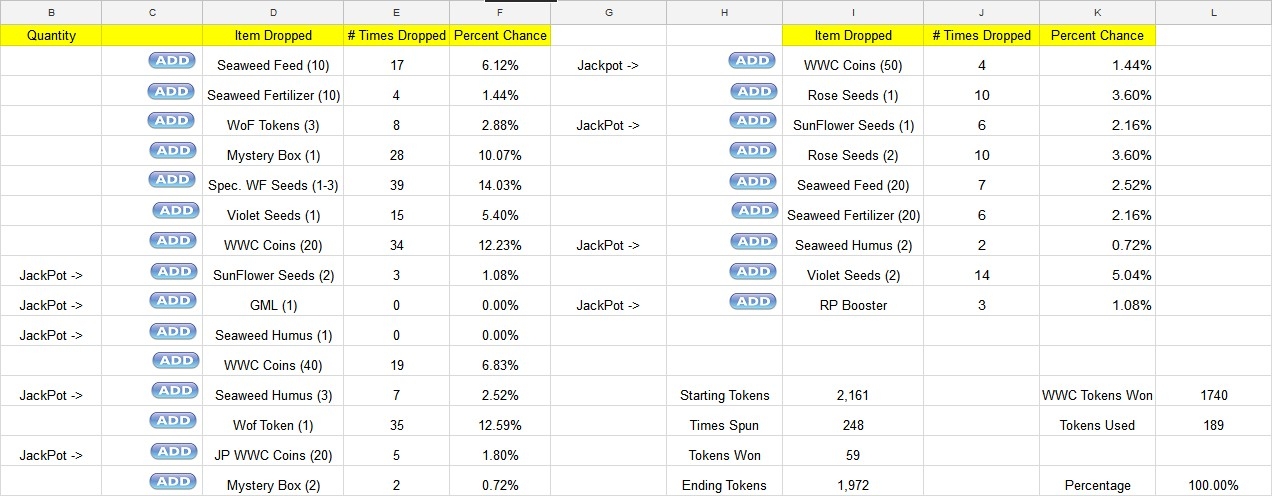 Broke the spreadsheet up into 2 sections, "Regular" Spins and "Jackpot" spins with their own percentages. Easier to see what the odds may be strictly for Jackpot Spins vs. Regular ones. The "100%" totals are the bottom are strictly for my use in checksuming the above percentages.