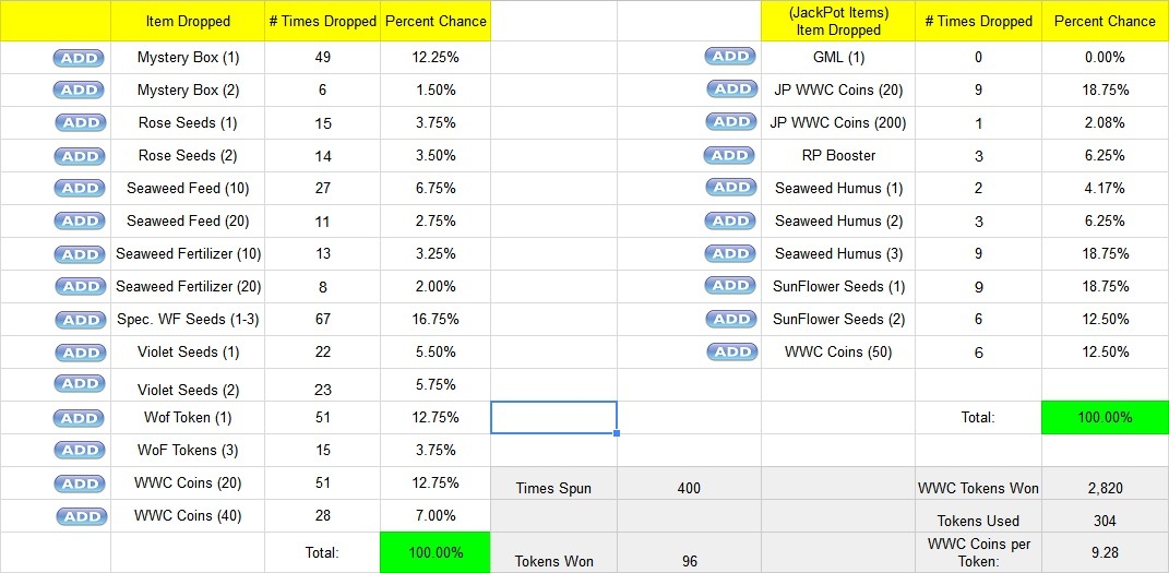 Averaging 9.2 Silver WWC Coins per WoF Token (Counting the ones I've won and reused). Not that bad. Still haven't received a single GML or a Coins reward over 50, though.. But I'ma keep going!