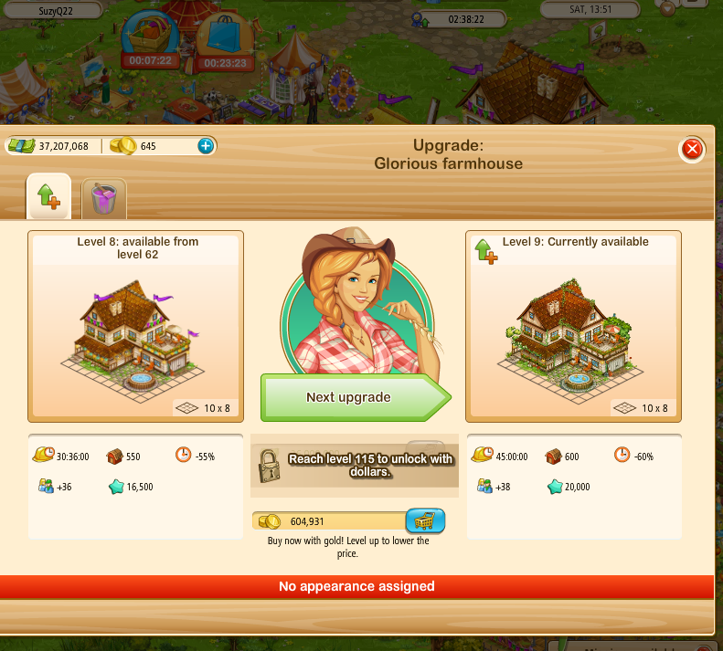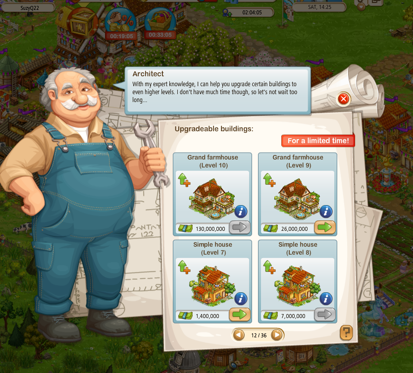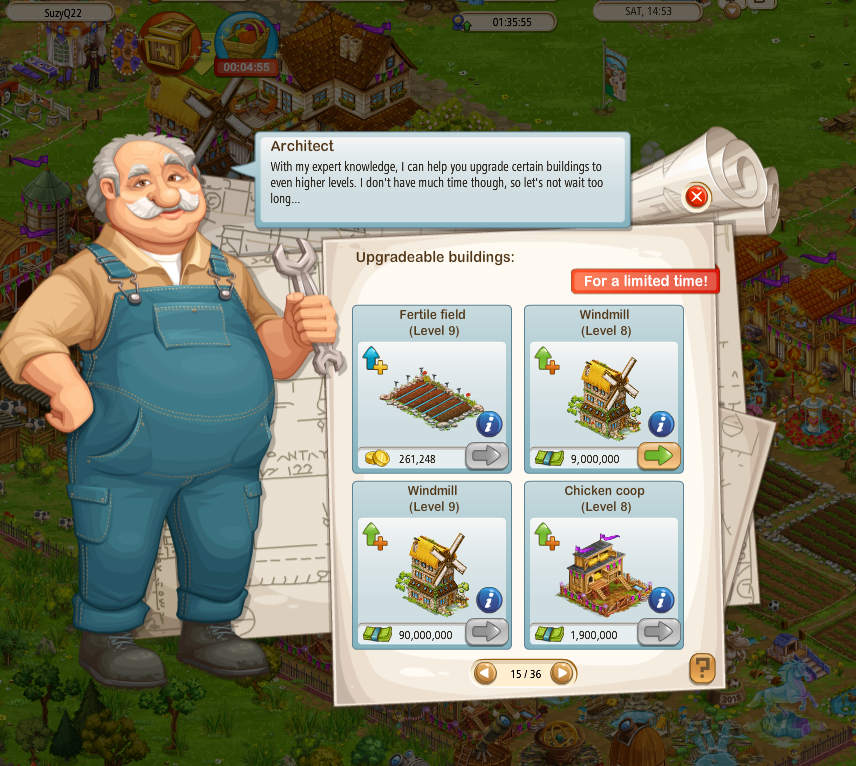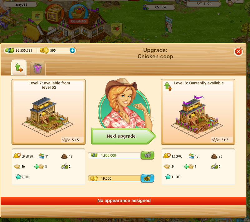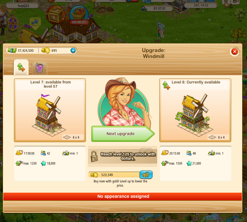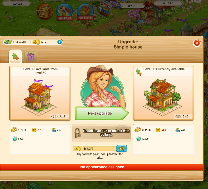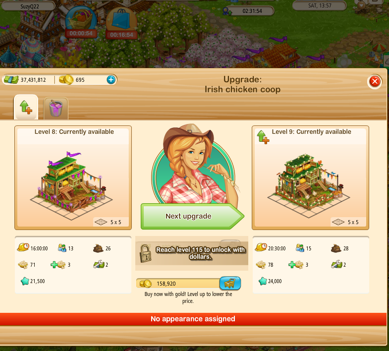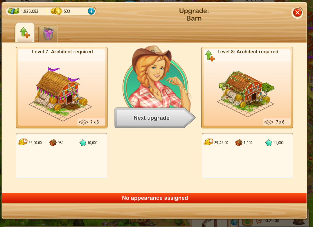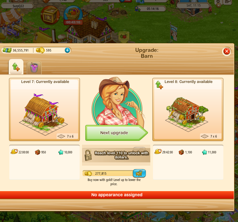 on the upgrade dialogue when Steve is NOT on your farm - Grey-out the payment button, in Steve's dialogue, when the upgrade is unavailable or show the level restriction in Steve's dialogue