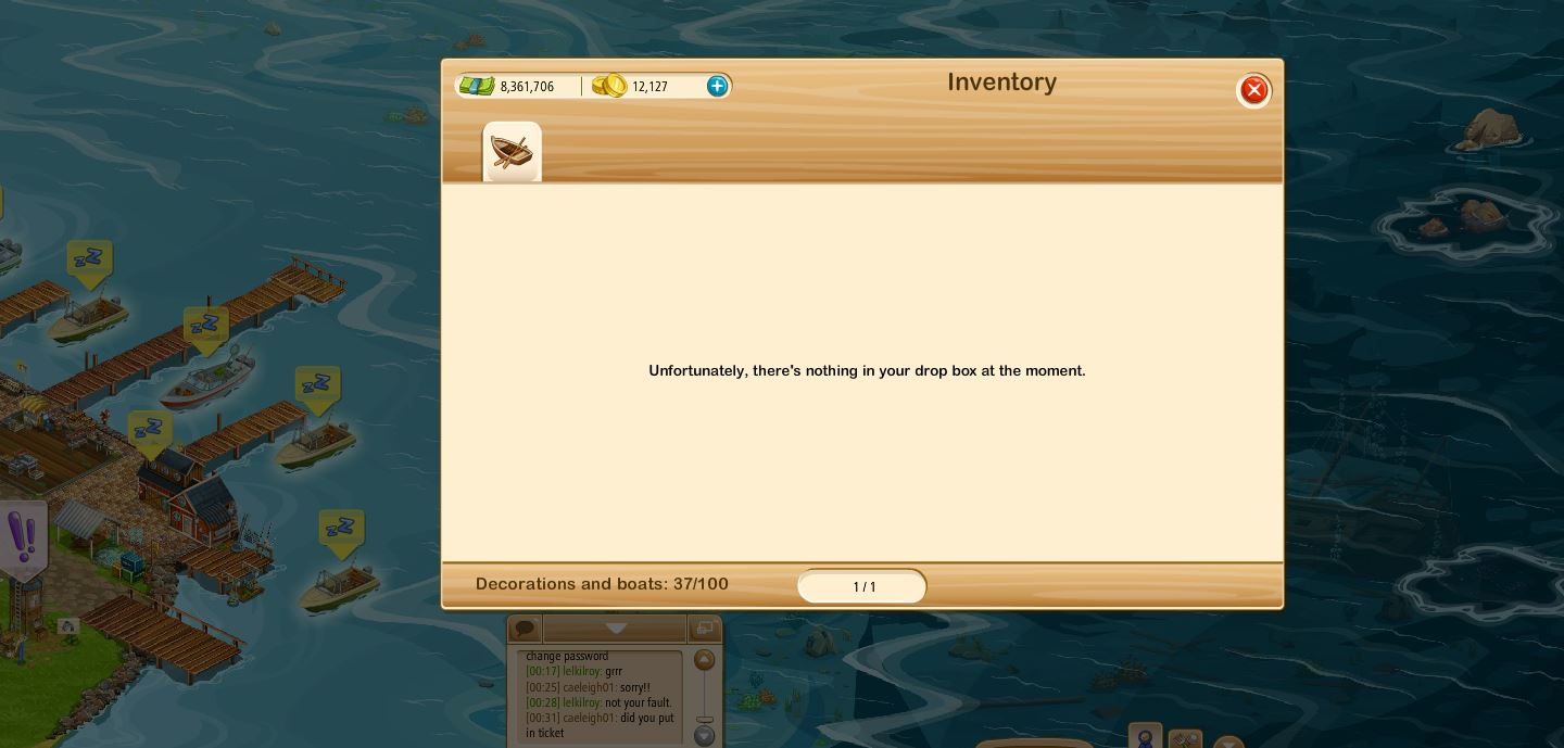 While in the DockYard, I have never seen anything in that box. EVER. however please note along the bottom of the inventory box it says decorations and boats 37/100. So either I have 0/100 items or I have 37/100 items I cannot see. This may need to go to support but I have spent the last 37 minutes trying to get to support and no joy. (not sure where the problem is but can't get to support. Again I have never gotten anything for fishing region from this box. My Dock yard is Level 8 see screen shot below