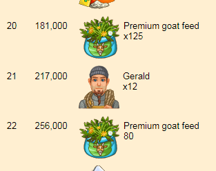 #20 reward is 125 Premium goat feed when you reach 181,000 points