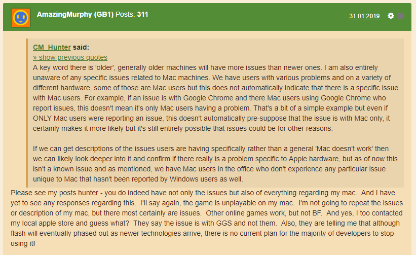 As for your "Mac issues" we have repeatedly told you that we are unaware or any issues being specific to Mac users & if you want your issues to be addressed you should post them on the current feedback thread just like everyone else. CM_Hunter even directly asked you to do that: