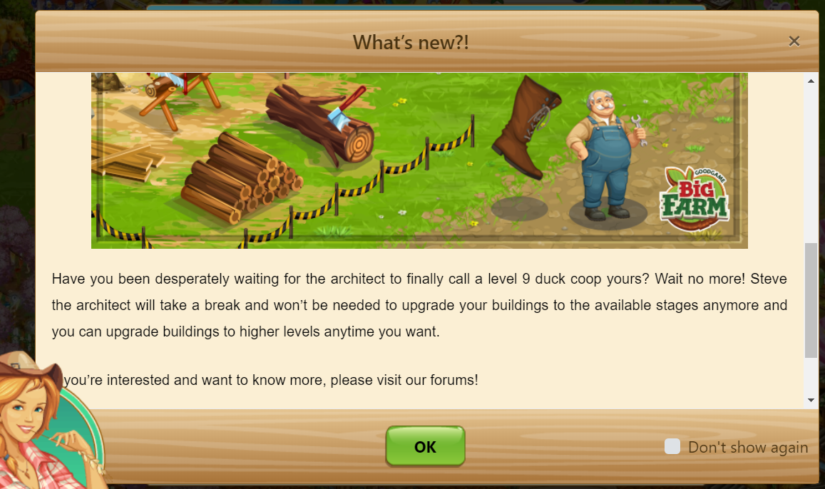 Maybe its a ploy to level the playing field amongst high-level farms vs. mid-level farms, and generate closer competitions where the long-term-high-levels farms have dominated in several consecutive events. I feel it would be fair to increase the max upgrade level for buildings to 10, 11, 12, since some of the high-level farms have already max-upgraded their buildings and haven't needed Steve for a long time.