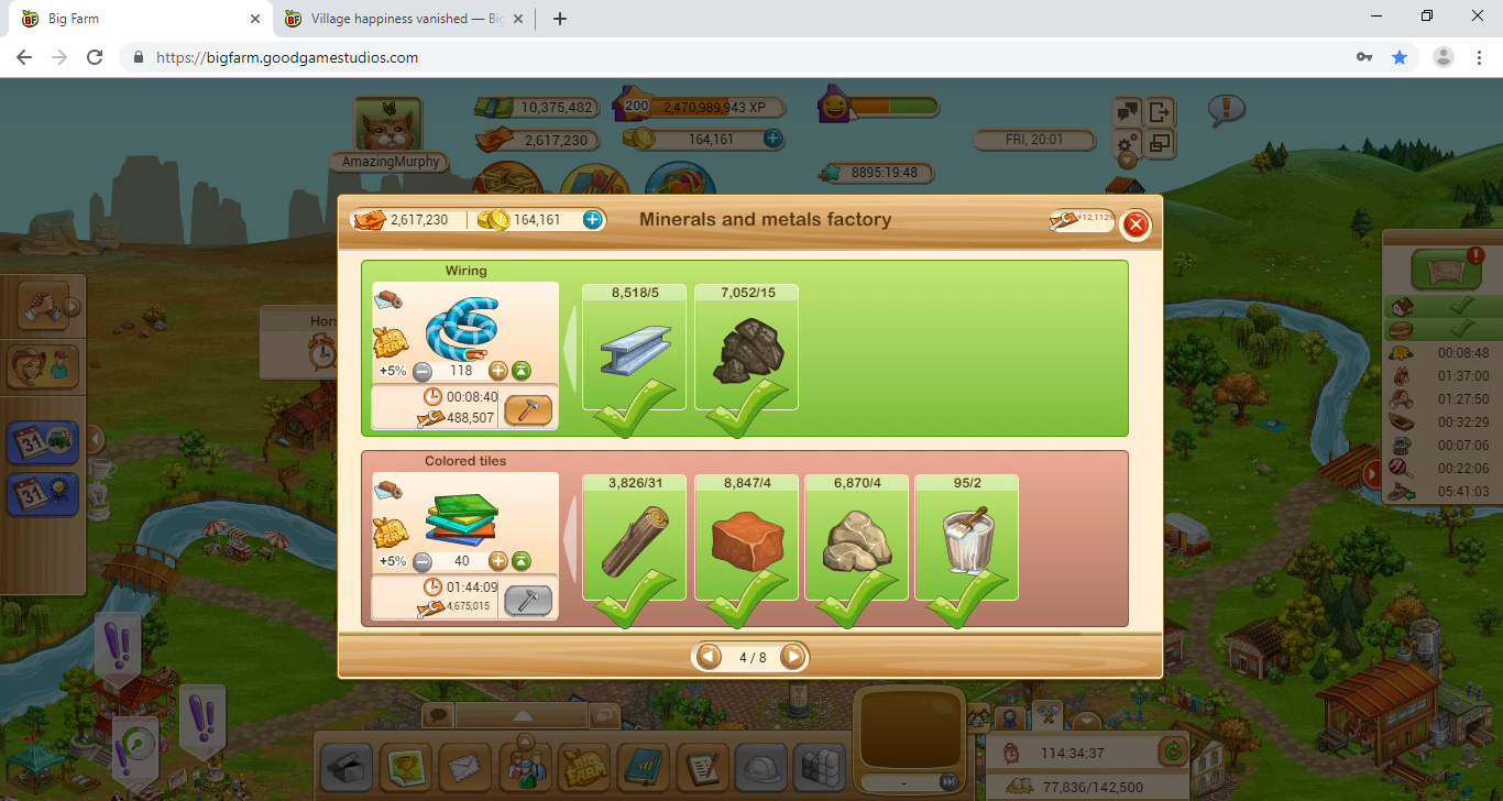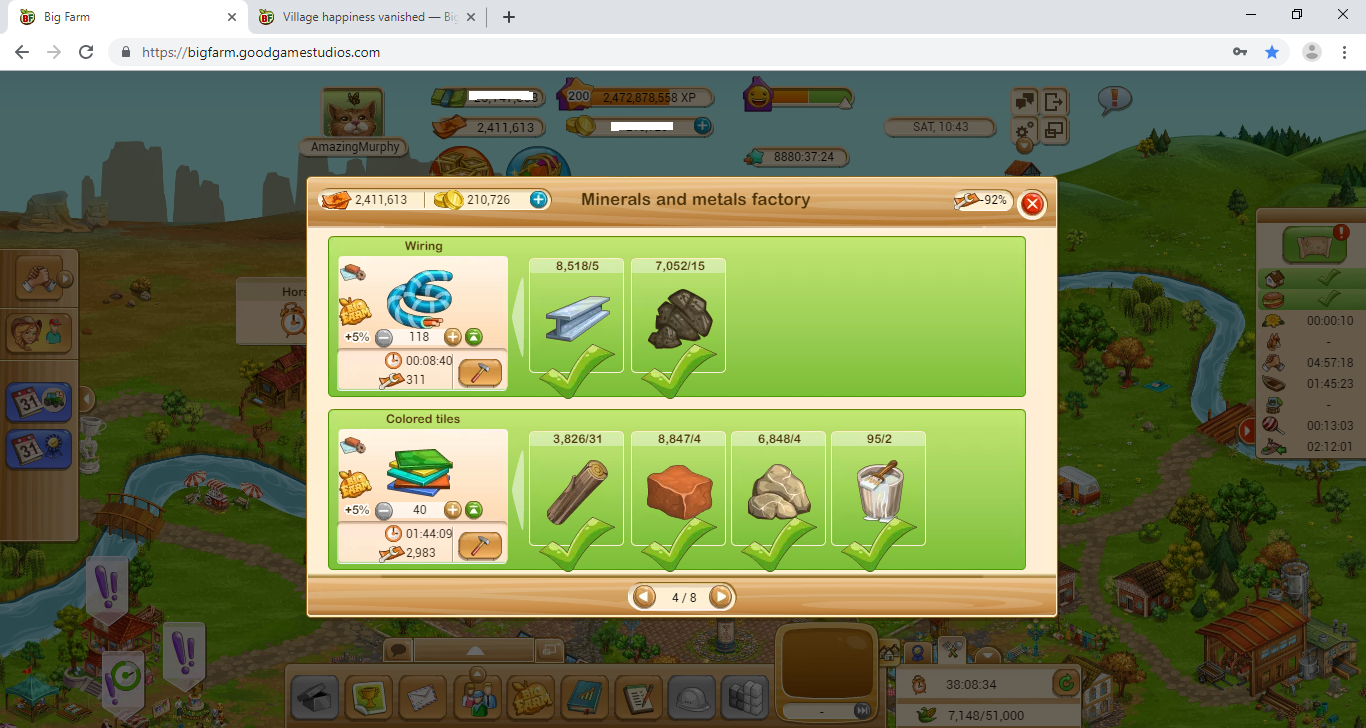 My village happiness is now on Village construction progress -633, Village happiness +3451, Happiness 2818