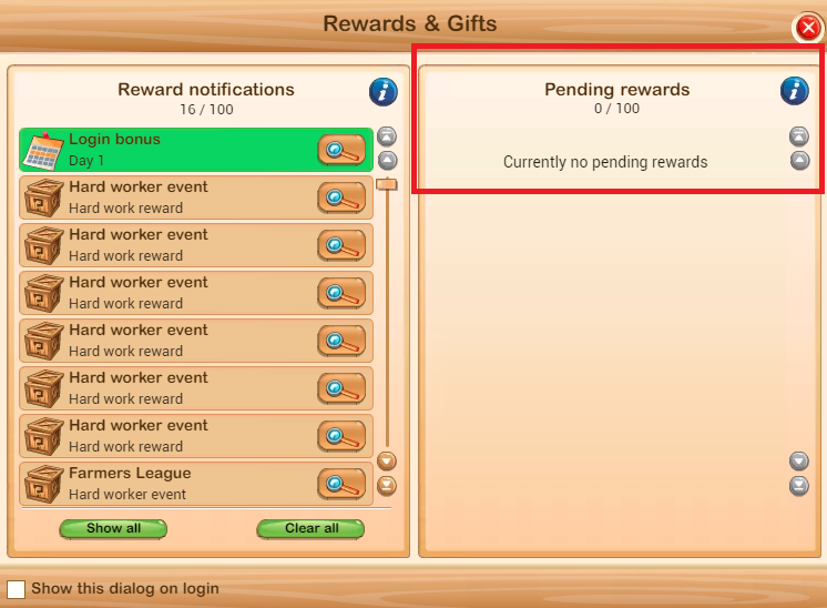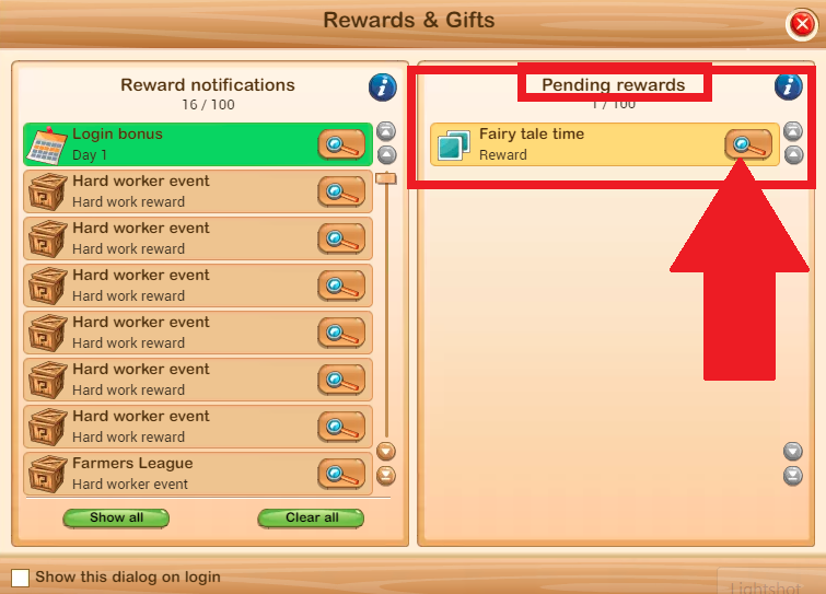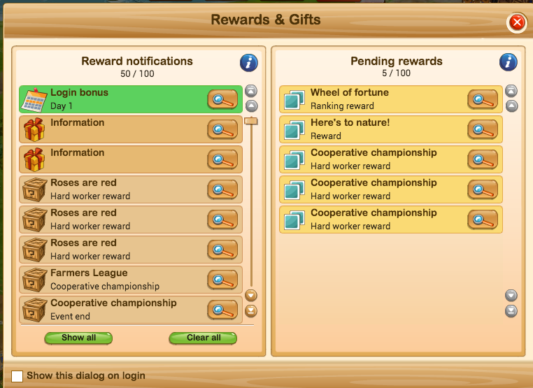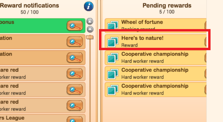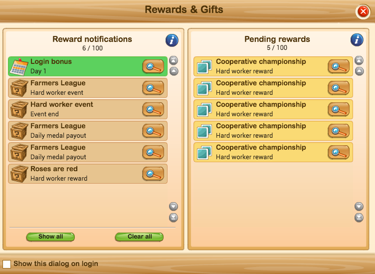 PS. Just in case you haven't realised this, the notifications on the left hand side of the panel are only notifications. They are merely informing you of the things you have already won or received, for example, hard work rewards during the CC, or the Hard Worker Events. Those are the notifications that used to pop up every so often while you were doing missions or filling the silo, to tell you that you won 40 sacks of feed or sunflower seeds, or whatever. You receive those things the minute you win them, no need to claim them. As said, the left hand panel only informs you that these things have happened because you are no longer receiving numerous pop-ups doing that job.