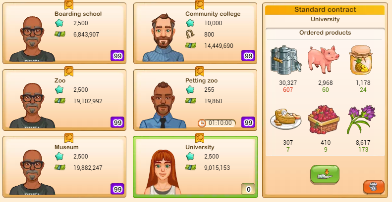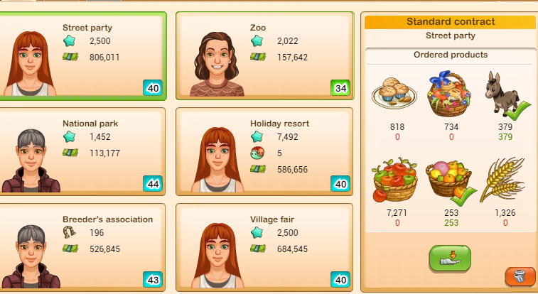 A useful tip for the organic market (this also works for the fishing market and is even more important there) is that the contracts have different qualities for different numbers of items. For example, in my contracts you only saw one or two item contracts. Those all have quality 99 because I have accepted a lot of them and they have reached the maximum quality level. But for three, four, five or six item contracts, they are at quality 0 because I always decline them like this contract.