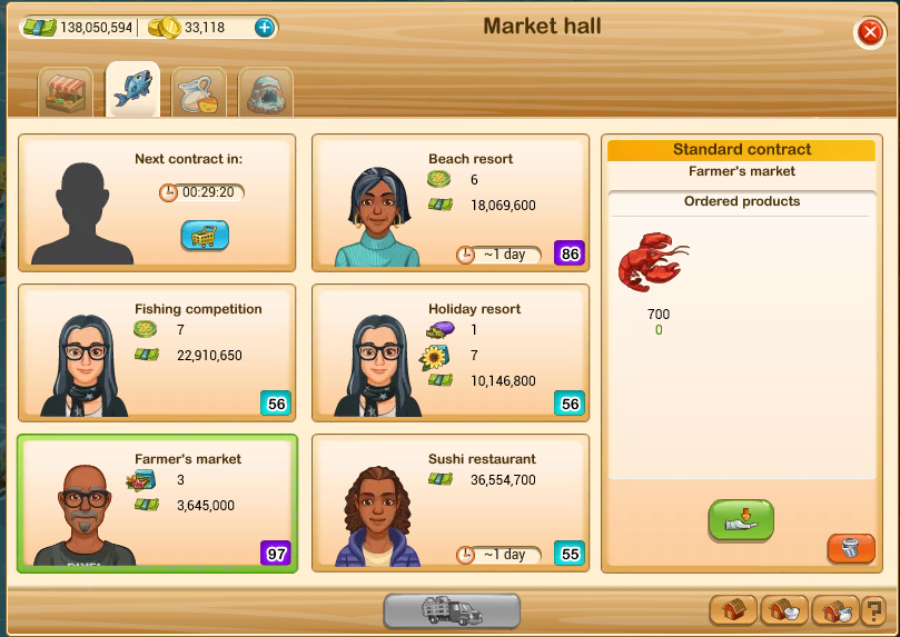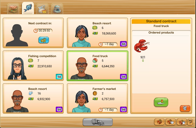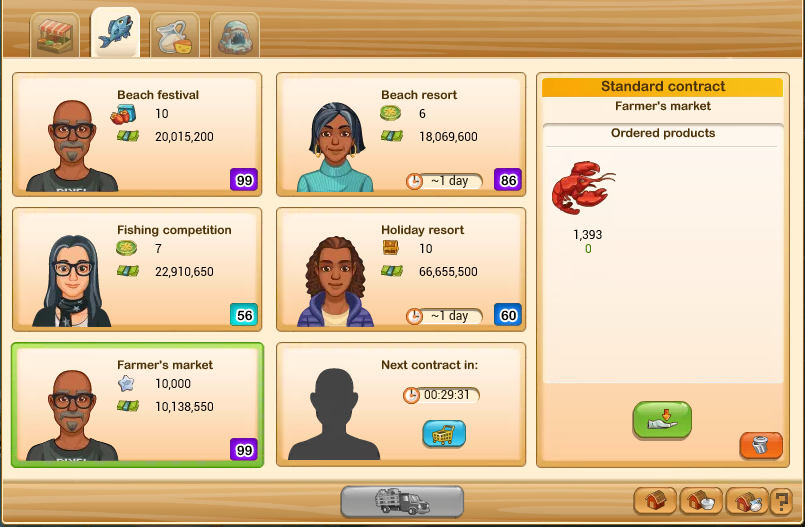 The organic market is different with the fact that you cannot use all of your produce (apples, eggs, milk, almonds, honey, etc.) in contracts so you are looking to maximise how much produce is used in the contracts (although one item only contracts are still a good strategy here). Whereas the problem is how to make the best use of the fish in the fishing market.
