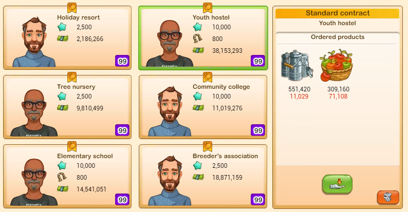 I also decline most all jam contracts, and focus on the 1 or 2 item contracts only (like Mollie said, since Lester can help with only 1 item, it makes sense). Although, even though my organic market contracts were all up there, for just the $ reason of Lester, I at one point started declining all 3-6 item contracts there too. Now in both markets, only the 1-2 item contracts are at level 99.