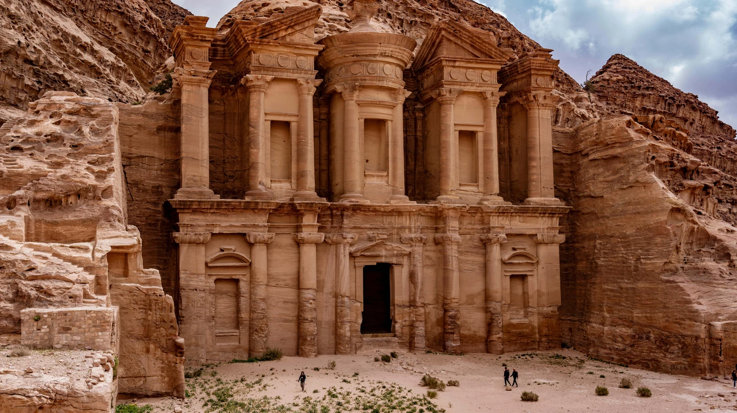 Petra (Arabic: ٱلْبَتْرَاء, romanized: Al-Batrāʾ; Ancient Greek: Πέτρα, "Rock", Nabataean: 𐢛𐢚𐢓𐢈), originally known to its inhabitants as Raqmu or Raqēmō, is a historic and archaeological city in southern Jordan. It is adjacent to the mountain of Jabal Al-Madbah, in a basin surrounded by mountains forming the eastern flank of the Arabah valley running from the Dead Sea to the Gulf of Aqaba. The area around Petra has been inhabited from as early as 7000 BC, and the Nabataeans might have settled in what would become the capital city of their kingdom as early as the 4th century BC. Archaeological work has only discovered evidence of Nabataean presence dating back to the second century BC,[8] by which time Petra had become their capital. The Nabataeans were nomadic Arabs who invested in Petra's proximity to the incense trade routes by establishing it as a major regional trading hub