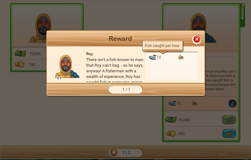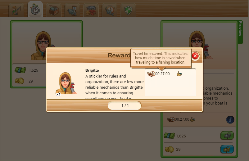 Brigette is the travel time crew member. She shaves 27 minutes off of the travel time of the boat in each direction (total of 54 minutes saved per Brigette per trip) and she is the least expensive crewman/equipment to add to your boat. Especially valuable when fishing for cod, salmon, and swordfish since they are always in the fishing pools that take the most travel time to reach (the farthest fishing pool takes 11 hours travel in one direction) and are the most valuable fish to sell.